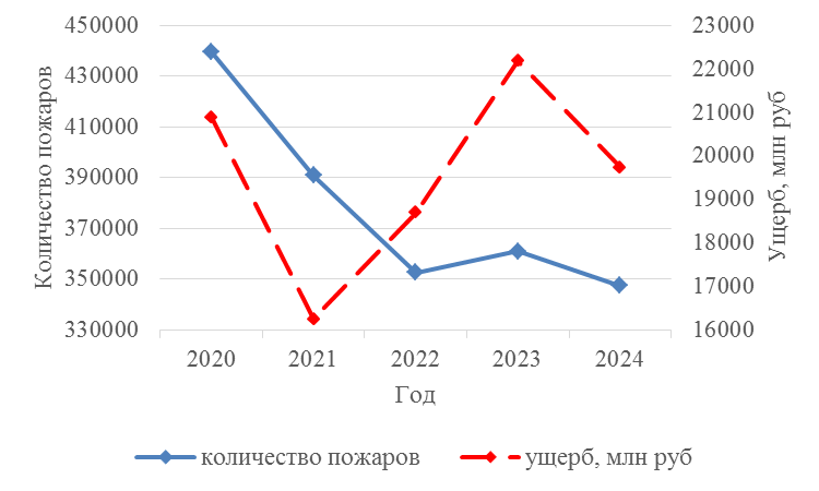 Анализ статистических данных демонстрирует устойчивую тенденцию к снижению общего количества пожаров. Однако, несмотря на уменьшение числа возгораний, наблюдается стабильный рост прямого материального ущерба, причиняемого пожарами, что указывает на увеличение их интенсивности и масштабов последствий (Рис.1). [2] Данное расхождение указывает на изменение характера пожаров, связанное с увеличением их масштабов и усложнением условий тушения.